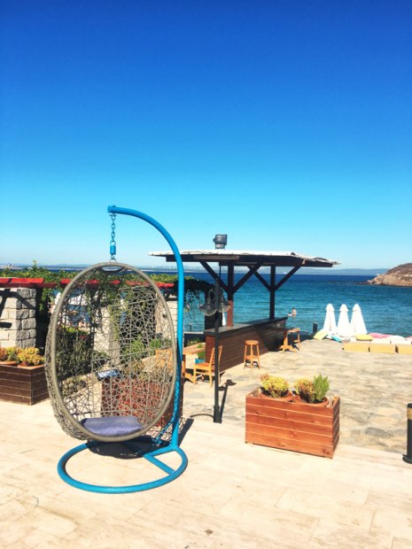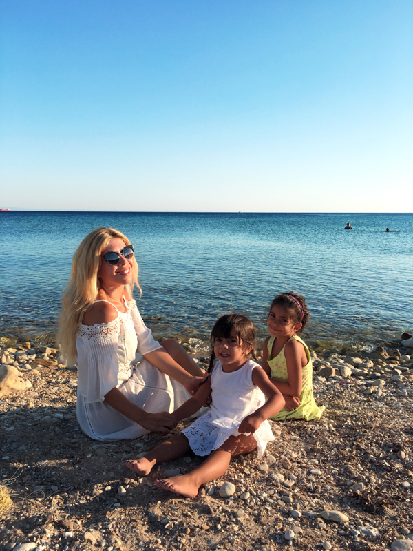 Pelagos Otel’de hem kaldığımız eve yakın olduğundan hem de çocuklarla rahat ettiğimizden tercih ettiğimiz plajlardan biri oldu. Sahilinde bir de havuzu var. Adanın kuzeyindeki koylar güneye göre daha rüzgarlı ve dalgalı olsa da burası korunaklı bir koyda yer aldığı için denizi de gayet keyifliydi. Yine bu bölgeye yakın Ataol Beach; çimlik alanları, su ve oyun parklarıyla çocuklar için bir diğer alternatif olabilir.