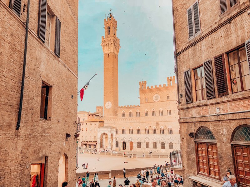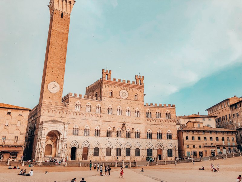 Siena’da görülmesi gereken yerler yelpaze biçimindeki ünlü meydanı Piazza del Campo’nun etrafına yer alır. Bu sevimli meydanı çevreleyen kafelerden birinde ya da İtalyan gençlerin yaptığı gibi meyanın ortasında yere oturup etrafı izlemek çok keyifli. 1293 yılında şehri yöneten Dokuzlar Konseyi burayı şehir merkezi yapmak için inşaatına başlamışlar. Meyandaki 9 dilim bu konseyi simgelemektedir. Tuğladan oluşan meydan 1349 yılında tamamlanabilmiş. Yüzyıllar boyu baa güreşleri, idamlar, at yarışları bu meydanda yapılmış. Sanki bütün bu hikayelerin bu meydanla beraber halen yaşamakta. İnsanı etkileyen çok farklı bir enerjisi var. Meydanda bulunan Gotik belediye sarayı Palazzo Publico’nun 102 metrelik çan kulesi İtalya’da inşa edilen ikinci en yüksek Ortaçağ kulesidir. (Torre del Mangia) Biz kızlar için yorucu olacağından çıkmadık ama harika bir Siena manzarası için 400 basamak ile ulaşılan kuleye çıkabilirsiniz.