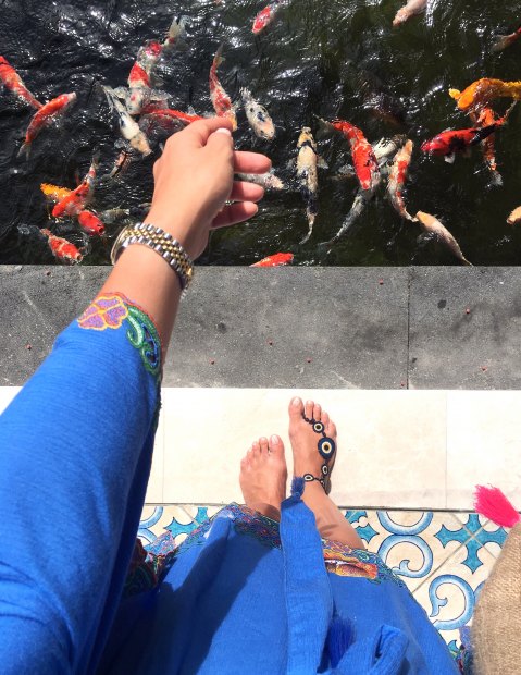 Oradan Blue Point’e doğru yola çıktık. Deniz çok dalgalı olduğu için plaj kısmı kapalıydı. Yukarıdaki manzaralı terasta bir şeyler içip dinlendik. Örgü ören yaşlı yerli kadınlardan bileklik aldık, sohbet ettik. Mina dönene kadar minicik kolundan örgü bilekliğini hiç çıkarmadı.