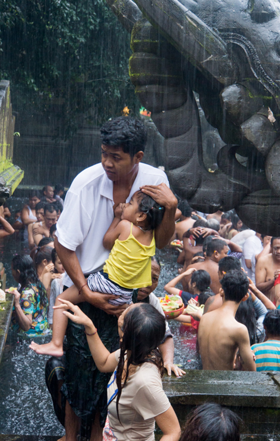 Ve bir anda bizi sırılsıklam eden ılık yağmurun altında Mina ile Balili halkın arasında karışıp tapınağın en keyifli anlarına tanıklık ettik. Tüm ısrarlarıma rağmen rehberle beraber bu havuza girmek istediğini söyleyen meraklı kızıma engel olamadım. Yarım metrelik havuzun içinde kalabalığı takip eden Mina için bu ritüel çocukça bir eğlenceden başka bir şey değildi :)) Hiçbir önyargı düşünce ve korku yaşamadan salt saflıkla anın tadını çıkarıyordu. O gülücüklerine devam ederken bende içimden dua edip Allah’a onun için bu an için, sahip olduğum ve olamadığım herşey için şükrettim. Daha sonra yağmurun hafiflemesi ile birlikte bizde otelimize doğru yola devam ettik.