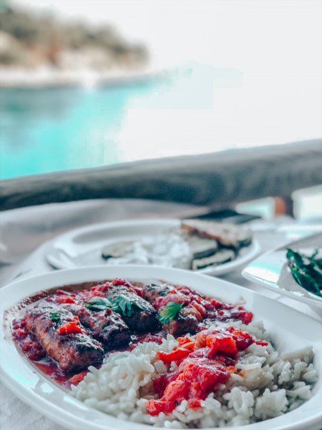 Yol boyunca yan yana dizili çok sayıda restaurant göreceksiniz. Menü genellikle Yunan ve balık ağırlıklı. Bizim mutfağımıza çok benzediği için kendinizi Ege ya da Akdeniz’de gibi hissedebilirisiniz. Burada özellikle çıtır kabak-patlıcan, musakka, ahtapotu çok güzel yapıyorlar.