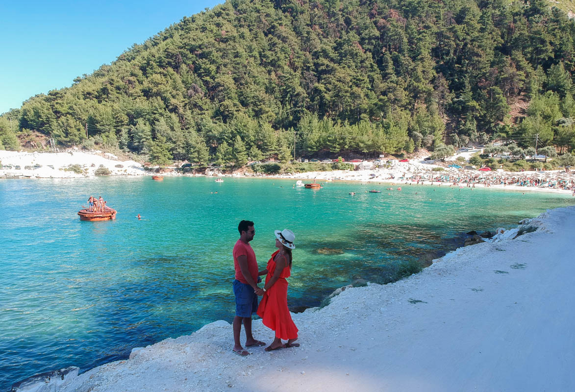 Marble Beach’in hemen ilerisinde Porto Vathy Beach var. Buranın denizi de gerçekten çok güzel ve nispeten daha sakin. Hemen yanındaki mermer ocağı ile masmavi deniz birleşince ortaya ilginç bir görüntü çıkmış.